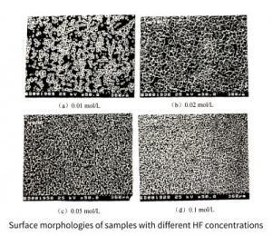 Figure 3-17 shows the surface topography of samples with different concentrations of HF added. It can be seen that the surface pit density of the samples increases uniformly with the increase of the added HF concentration, which is consistent with the trend that the anodization peak current increases with the increase of the HF concentration. Samples after cycle testing. The trend of increasing specific capacitance with increasing HF concentration is consistent (see Figure 3-18)