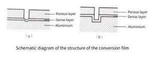 Due to the corrosion of active anions, the conversion film on the surface of the aluminum foil will form a double-layer structure film with the porous layer as the outer layer and the dense layer as the inner layer, as shown in Figure 3-19. (1).