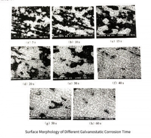 Figure 3-22 shows the surface morphologies of the samples when the galvanostatic corrosion time is 5, 10, 15, 20, 30, 40, 50 and 60S, respectively. White areas are corroded areas and black areas are uncorroded areas. It can be seen that with the prolongation of corrosion time, the corroded area continues to expand, and the uncorroded area continues to shrink. When the etching time exceeds 30S, the corrosion area expands to the whole surface, but when the etching time is shorter (less than 30S), the corrosion pores are clustered instead of uniformly distributed, which indicates that the initial starting position of corrosion is incomplete. It is more likely to randomly appear in impurity element-rich regions, grain boundary regions, dislocation regions or defect regions.