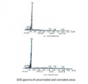 It can be seen from Table 3-2 that most of the surface of the sample is aluminum in both the corroded area and the uncorroded area. The elemental composition of the unetched regions is relatively simple. Apart from AI, there are only O and Na signals. Na can be considered to be caused by the solution remaining on the surface of the sample, while O is caused by the presence of an oxide film on the surface of the unetched area. Besides O and Na, there are some Fe and Cu signals in the corroded region. Since these two elements do not exist in the solution, these Fe and Cu can only be the original impurities inside the aluminum foil. Therefore, elemental analysis indicates that the initiation of the initial etch pits is more likely to occur in impurity-rich regions.