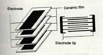 It can be seen that if the electrode spacing is made very thin (the d value is small, as long as the medium can meet the withstand voltage requirements), when the withstand voltage is only 6.3V or lower, the medium only needs 3um. Now the Class Ⅱ of ceramic dielectric can achieve this thickness. If the electrode can also achieve a thickness of 0.05um, a capacitor with a thickness of 1.5mm can be stacked 300 layers. Equivalent to the parallel connection of 300 capacitors, the relative permittivity of the Class Ⅱ of ceramic dielectric can reach 10,000. In this way, the capacitance of 100uF can be done.
