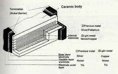 The cross-section of a MLCC can be seen as consisting of an entire ceramic block with comb-like junction electrodes, which are electrically connected to the surface of the end of the ceramic block by sintering in the metal layer. The principle structure of a multilayer multilayer capacitor is shown in the figure below.