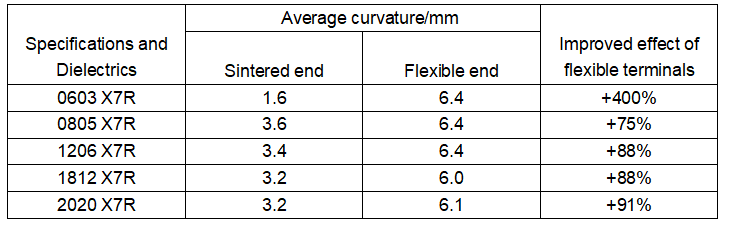 Since the flexible termination absorbs most of the mechanical stress from the bending of the circuit board, the bending degree of the circuit board required for the tearing of the multilayer ceramic capacitor is significantly improved.