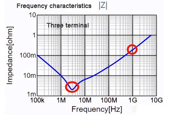 That is because the three-terminal capacitor has a special structure, which shortens the current path and makes the ESL have parallel characteristics, which in turn reduces the ESL and makes the high-frequency characteristics good.