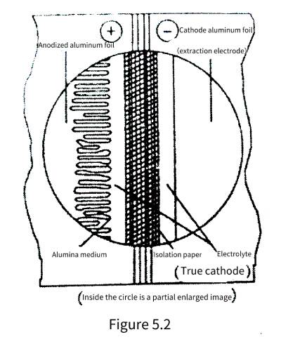 ⭐️The electrode structure of an aluminum electrolytic capacitor is shown in Figure 5.2. Among them, the anode aluminum foil is made of high-purity aluminum etched with many tiny tunnels to increase the contact area with the electrolyte. The enlarged part in Figure 5.2 is the microstructure between the two electrodes of the aluminum electrolytic capacitor.
